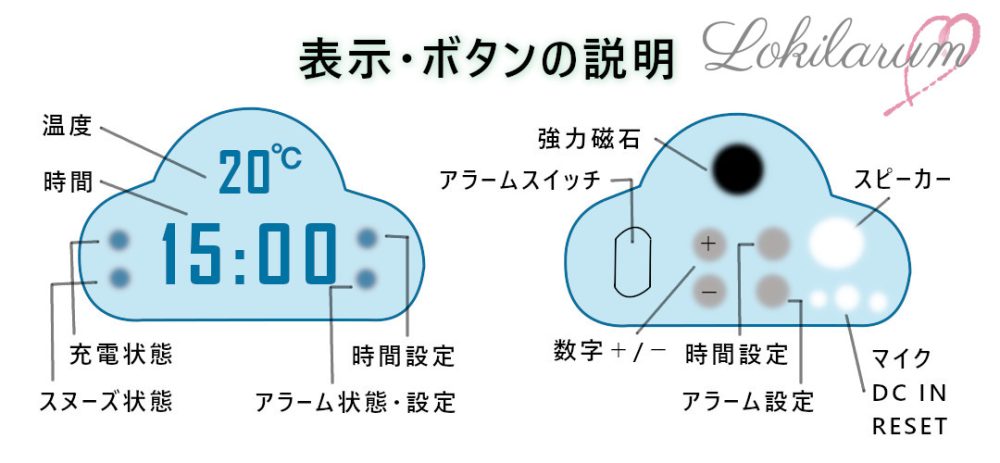 時間だけでなく、温度・日付(要ボタン操作)、アラーム(スヌーズ付き)のデジタル時計です。