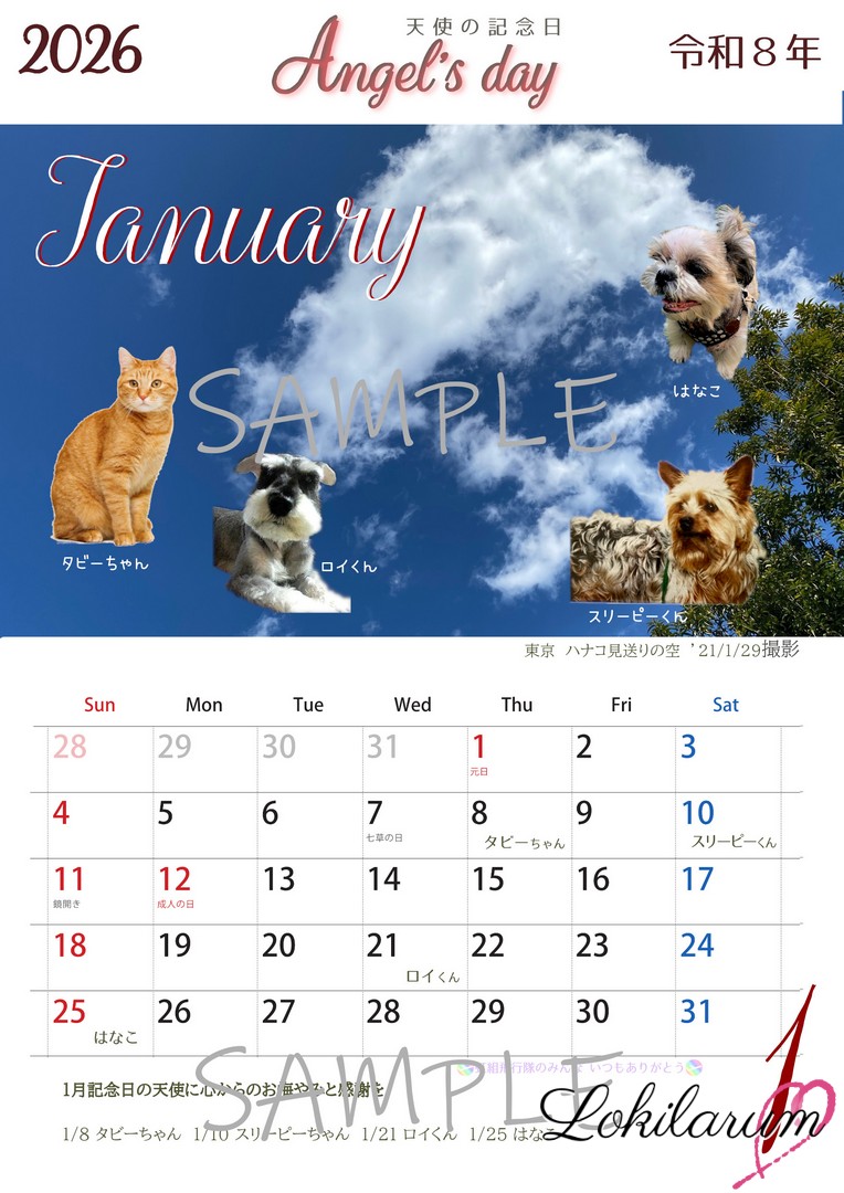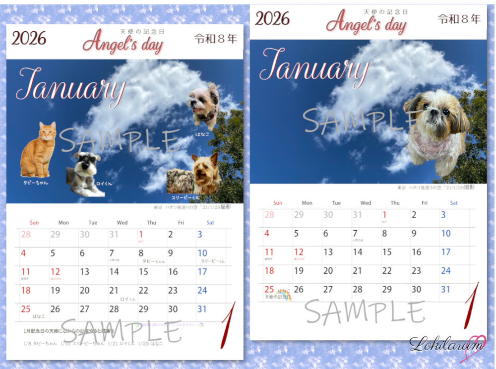 【Aタイプ】昨年までのカレンダー同様、参加天使ちゃん達全てが掲載されています。記念日月に虹の橋のたもとで待ってくれているお友達たちのお顔が並びます。Bタイプをお申込の天使ちゃんもAタイプに掲載します。