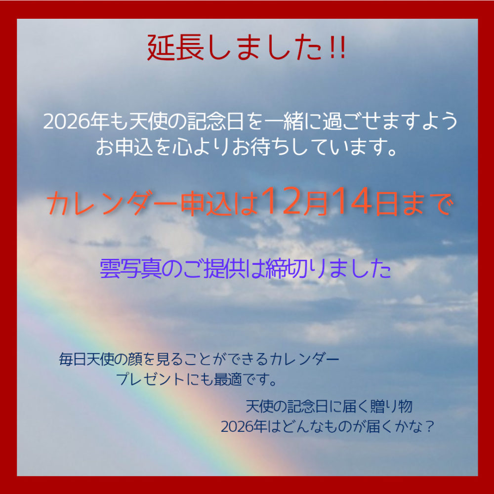2026年版の天使の記念日カレンダーの申込締切を延長しました。